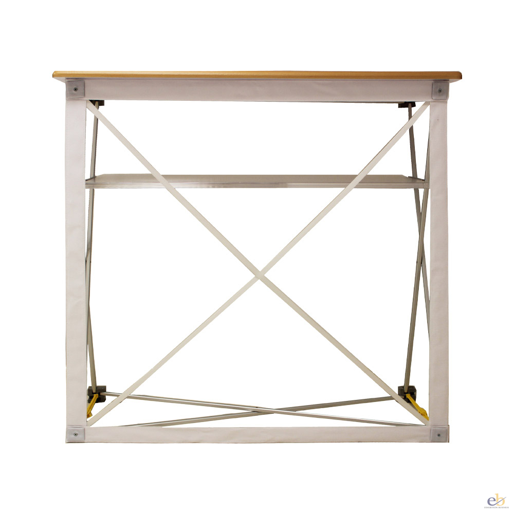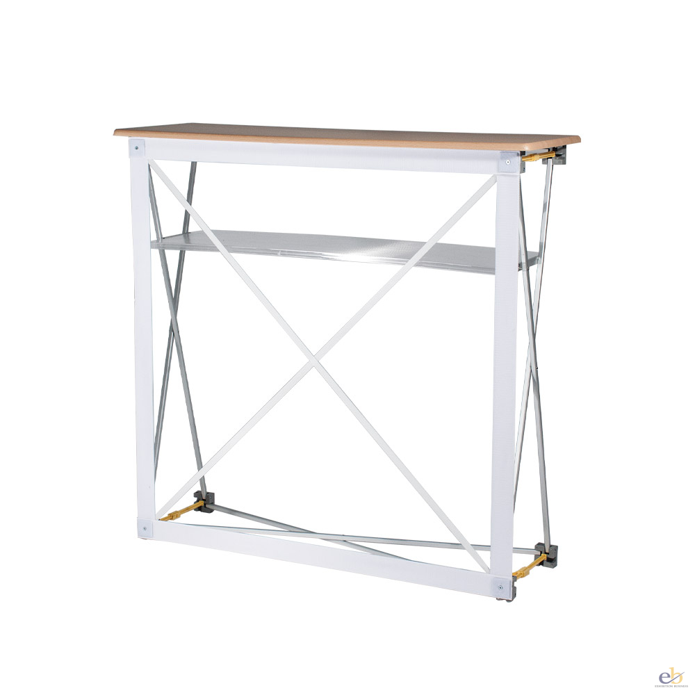 A durable light-weight hop-up counter, quick and easy to assemble with a single wrap around fabric graphic. Perfect to welcome your guests Tool free assembly Single fabric wrap Quick change graphic Single shelf Carry bag included