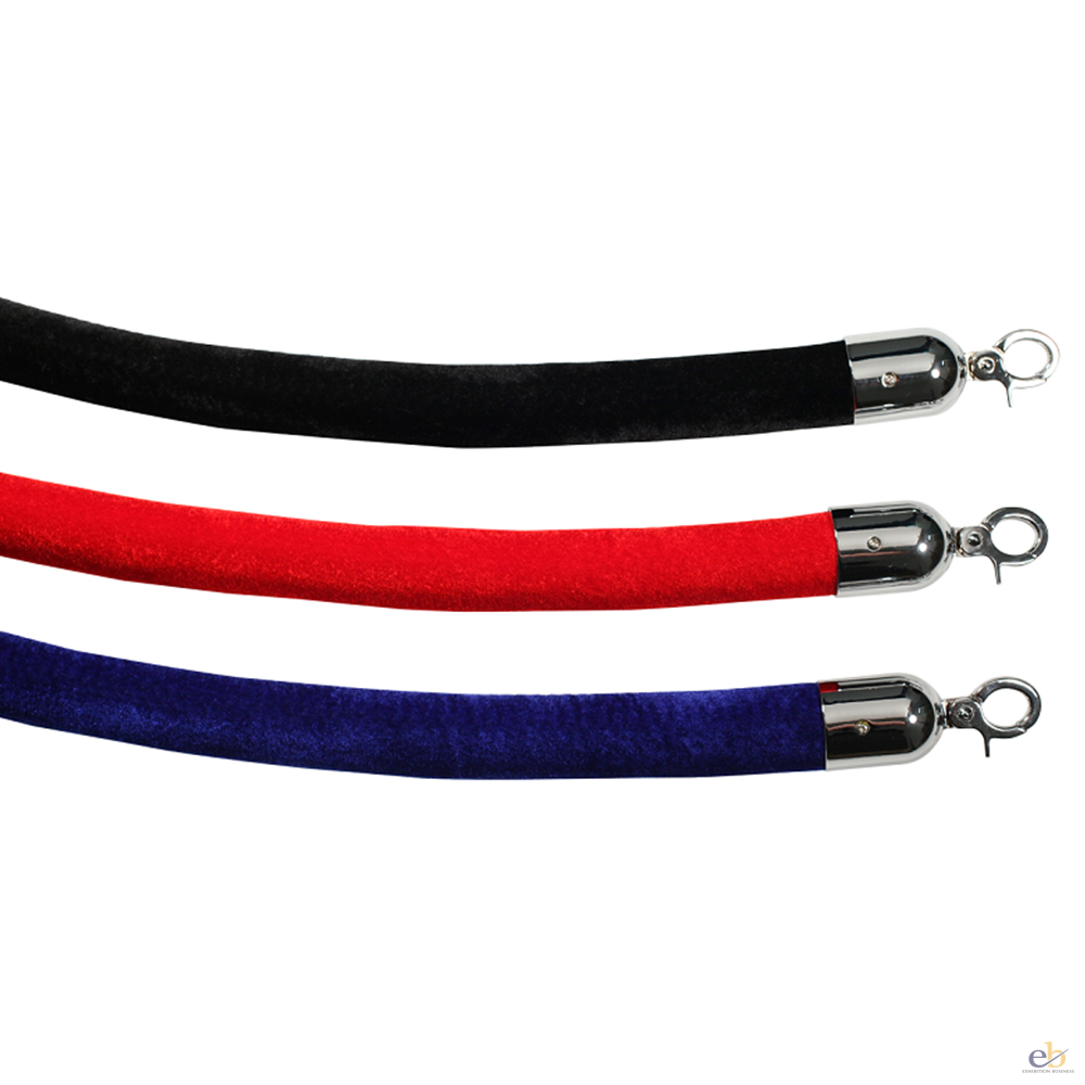 An economy range of exhibition and event queue guidance system, 1500mm rope available in black, blue or red, either connector or hooks in gold or silver, Basics Leader Rope: 1500mm rope to connect to each post, available in black, blue or red.