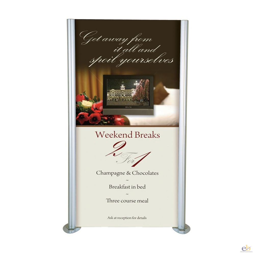 Part of the Linear modular kit collection; a robust freestanding presentation unit with integral LCD bracket.