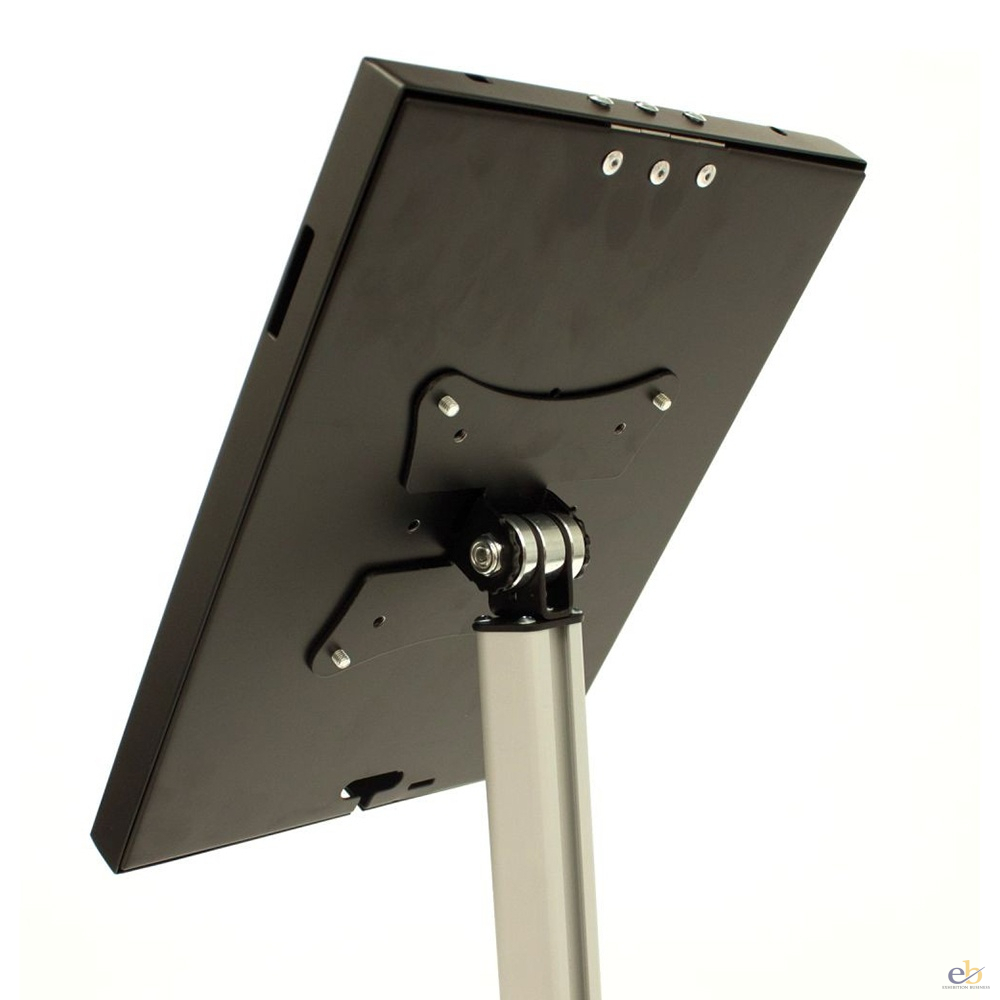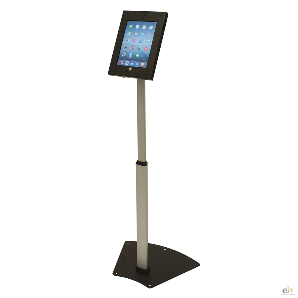Anti-theft telescopic floor standing iPad holder. The height adjustable unit holds the iPad securely in position housed in a lockable casing which can be tilted to give multiple viewing angles.