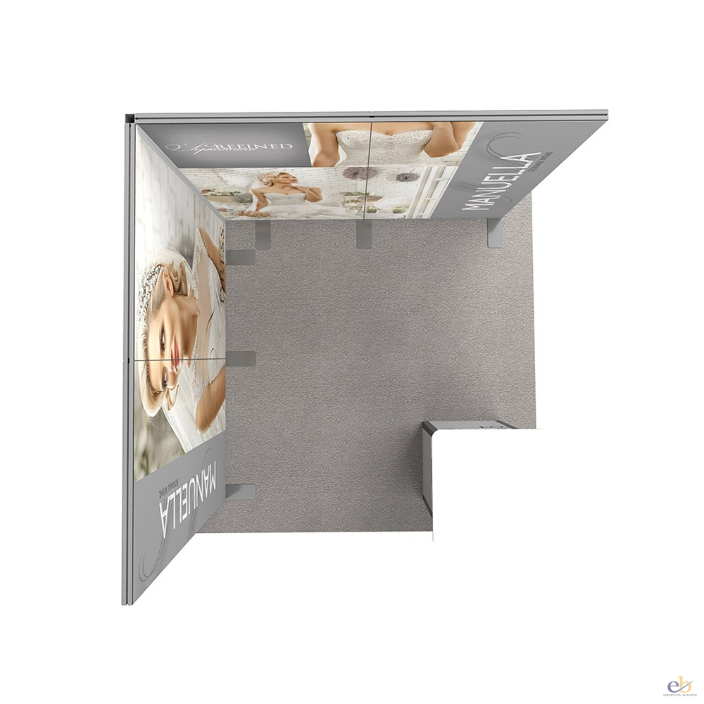 The “Vector Lite Custom Built Stand Kit S4 has two back walls made up of a selection of standard panels on slim feet, complete with a welcome counter.