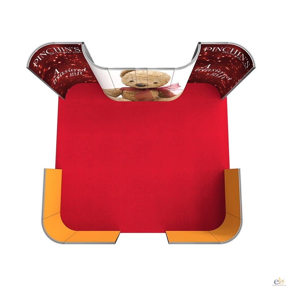 The Vector Lite Custom Built Stand Kit SC1 uses curved and straight panels offering a higher back wall with a curved feature in the centre, the front of the stand has two lower walls with curved corners to section off from the walk way.